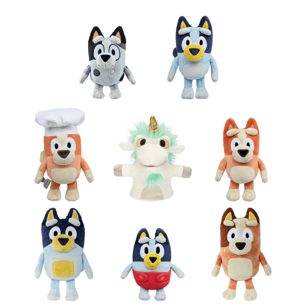 At 6.5-9" tall, they are just the right size to cuddle and take anywhere! Made with deluxe fabrics featuring high quality embroidered details, these super-soft plush are the perfect cuddly toy for playtime or storytime. here's a brand new Unicorse hand puppet as well as your favorite classic Bluey and classic Bingo plush, along with Bandit, Chilli, Baby Bluey, Chef Bingo and Muffin. Collect them all!