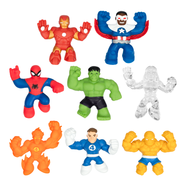 8 new Heroes of Goo Jit Zu the Marvel edition Minis to collect: Spider-Man, Hulk, Captain America-Sam Wilson, Iron Man, The Invisible Woman, The Thing, Mr. Fantastic and Human Torch.