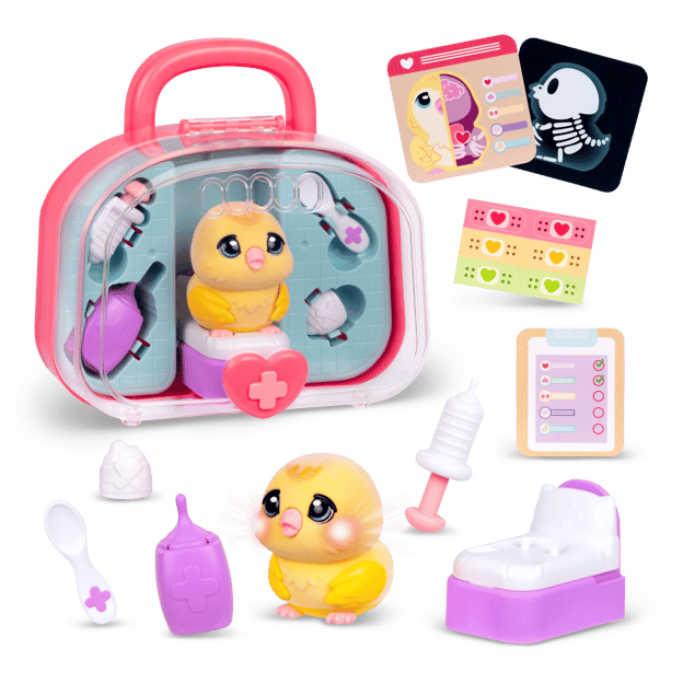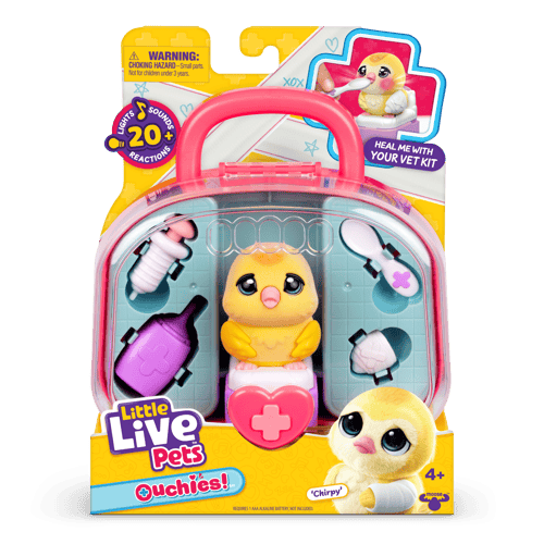 Chirpy the Chick and Coco the Hamster are adorable little pets that need your help to heal. Oh no… their cheeks are glowing – it looks like they’ve got an ouchie! Your vet kit comes with all the accessories you need to nurse them back to health with lots of love. Check the vet cards for clues on where to look for ouchies. Does Chirpy need some medicine, or maybe an X-ray and a cast for their wing? Or does Coco need their temperature checked and an ice pack? All healed now… until the next time your Ouchies pet gets sick or hurt again! Take your pet everywhere you go in the portable vet case, which also includes sticker bandages. Ouchies are super interactive with 20+ sounds, lights, and reactions – each pet responds with adorable sounds to tell you how they’re feeling. You’ll love the experience of caring for, diagnosing, and nurturing your Ouchies back to health. A truly unique vet care experience from Little Live Pets. There are 2 Ouchies Vet Kits to discover – Chirpy the Chick and Coco the Hamster - each with their own unique ouchies and accessories to heal them. Collect them both!