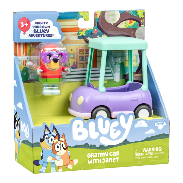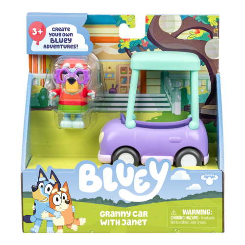 Ride along in the Grannies Car with Janet. This vehicle comes with a 3" (7.6 cm) Bluey figure dressed as Janet ready for granny adventures. With articulated arms and legs, she's perfect for play and posing. Children will love using these fun-filled cars to recreate some of the most memorable moments from the show and make up new adventures.