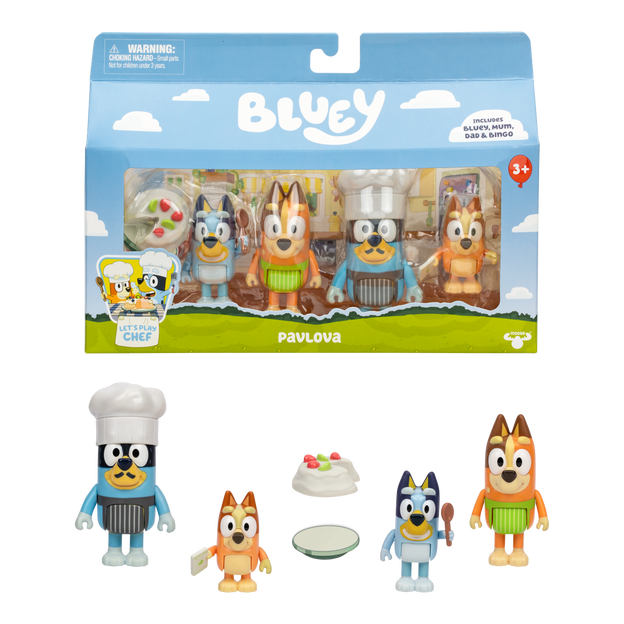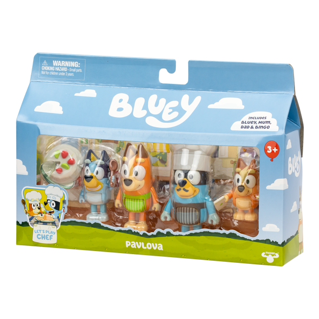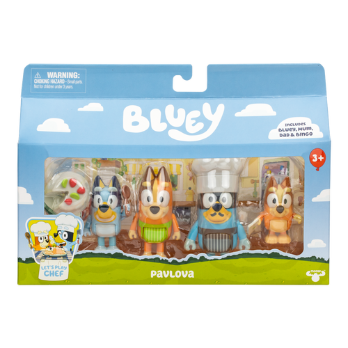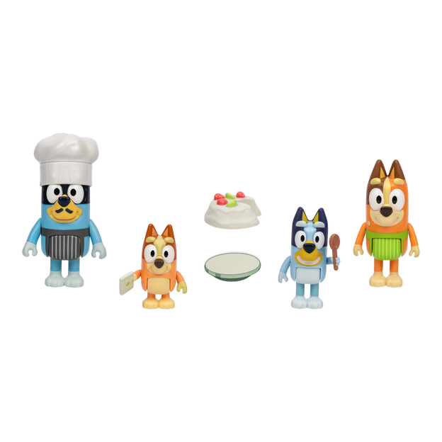 Includes Bluey, Bingo, Bandit in his Chef Hat, and Chilli