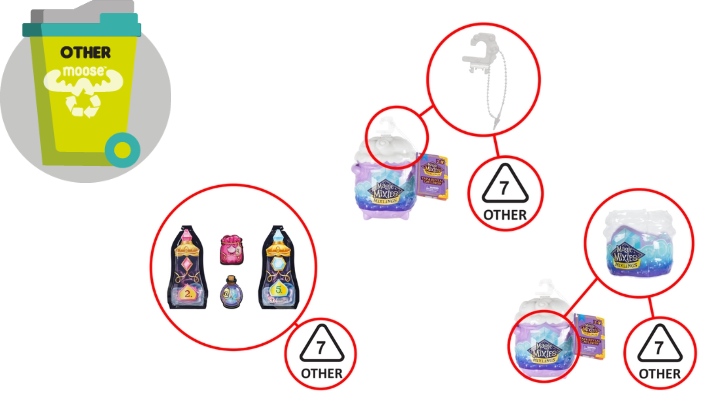 '"Autre 7" indique qu'il s'agit d'un type de plastique moins courant. Ces articles doivent normalement être éliminés dans une collecte non triée. Consultez votre municipalité ou conseil local pour des conseils sur la collecte. Les images ci-dessus montrent des exemples de ce matériau d'emballage.