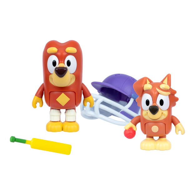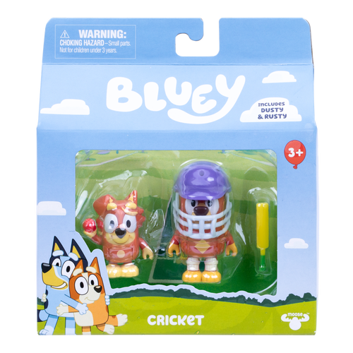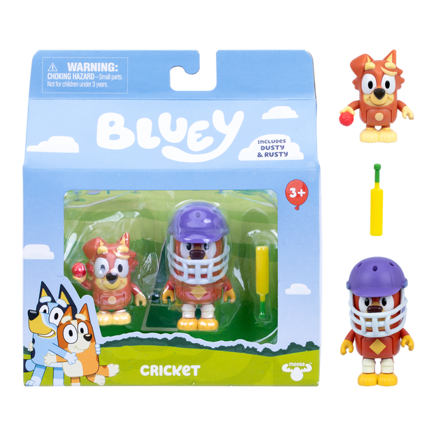 These 2.5-3" (6-7.6 cm) Rusty and Dusty figures inspired by the "Cricket" episode have moving arms and bodies, perfect for play and posing. The pack includes a helmet, cricket bat, and ball so you can try your luck bowling Rusty out. Fans will love recreating some of the most memorable moments from the show with these fun-filled toys! Also look out for the Rug Island Figure 2-Pack, featuring Bluey and Bingo, including paddleboard accessory set!