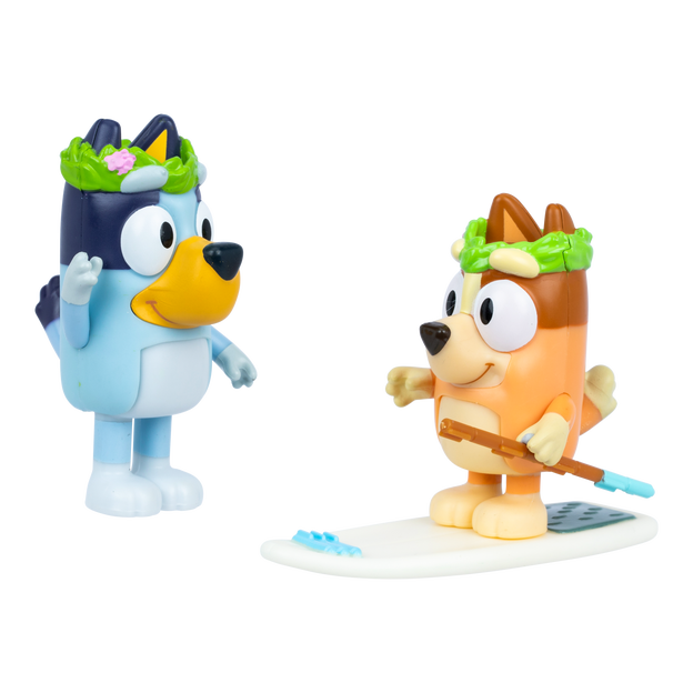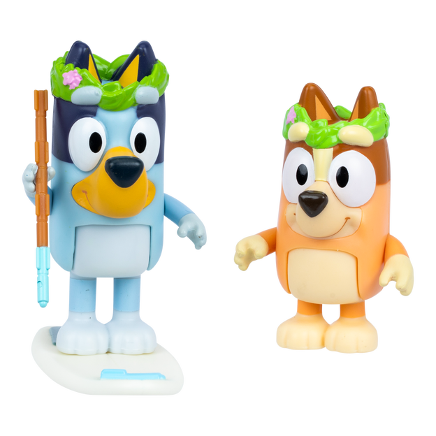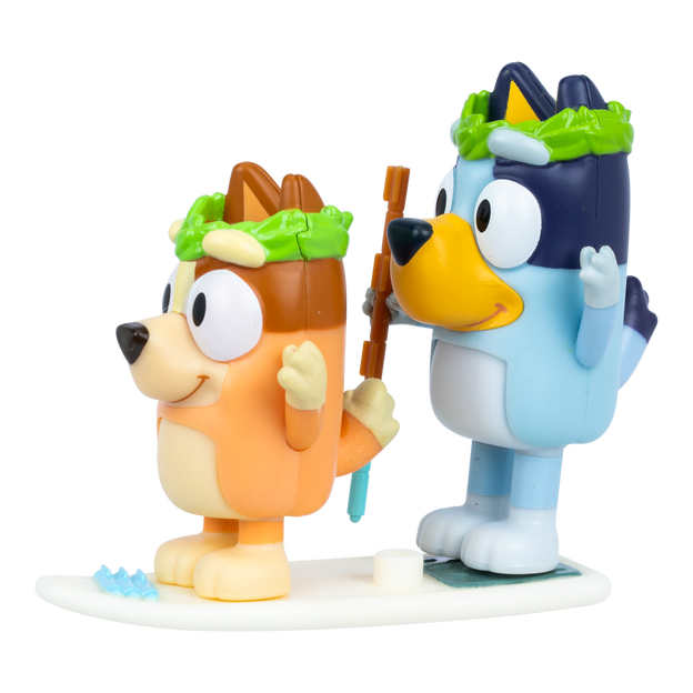 These 2.5-3" (6-7.6 cm) Bluey and Bingo figures inspired by the "Rug Island" episode have moving arms and bodies, perfect for play and posing. Bluey and Bingo are wearing flower crowns, and come with a paddleboard set complete with felt pens. Fans will love recreating some of the most memorable moments from the show with these fun-filled toys! Also look out for the Cricket Figure 2-Pack, featuring Rusty and Dusty, including helmet and cricket bat accessory set!