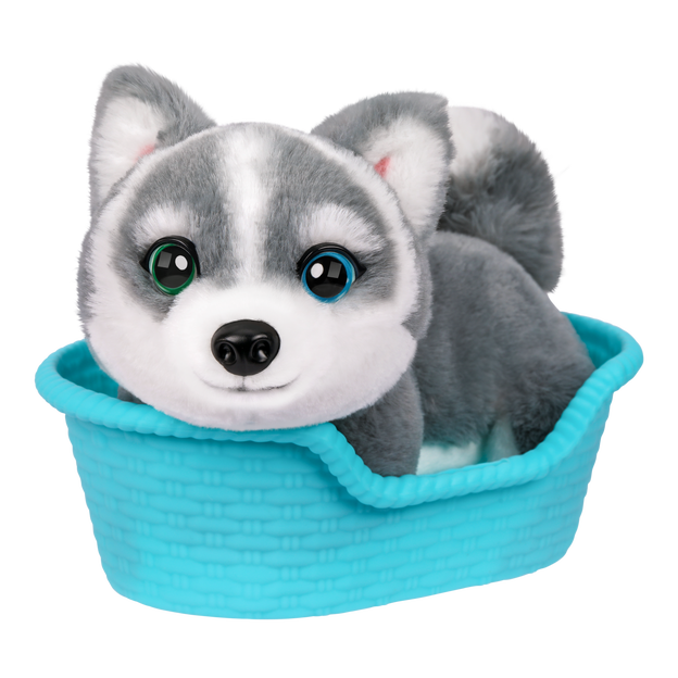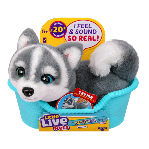 Meet Aurora, the adorable Husky puppy that looks and feels so real with the softest fur, irresistibly cute puppy eyes and reacts to your touch with over 20 sounds and reactions! Get to know Aurora by gently patting on her back and watch her come to life with adorable puppy sounds. Aurora comes with a cozy basket for display. Enjoy endless moments of puppy love with Really Real Puppy Minis.