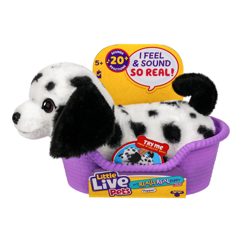 Meet Pepper, the adorable Dalmatian puppy that looks and feels so real with the softest fur, irresistibly cute puppy eyes and reacts to your touch with over 20 sounds and reactions! Get to know Pepper by gently patting on his back and watch him come to life with adorable puppy sounds. Pepper comes with a cozy basket for display. Enjoy endless moments of puppy love with Really Real Puppy Minis.