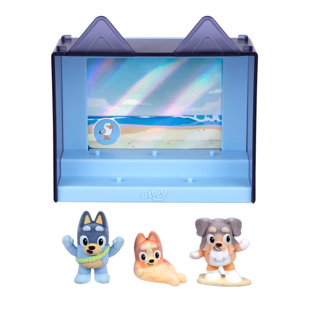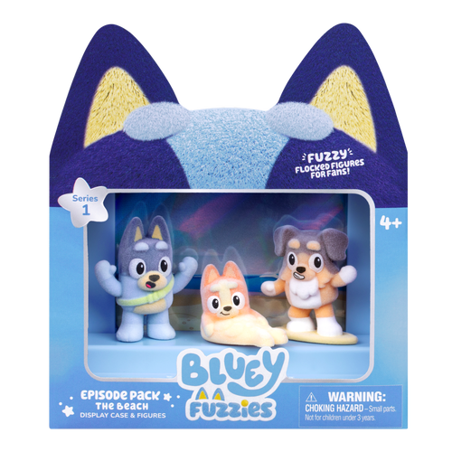 These mini collectible figures look as good as they feel, thanks to their soft, flocked finish that gives each figure their signature fuzzy feel. Every figure is inspired by a fan-favorite episode, so you can recreate iconic moments from the show. "The Beach" Episode Pack comes with 3 figures - Bingo, Bandit, and Surfer Dog. Pop them into the display case, which holds 5 figures, and make sure to look out for the other two figures from the episode to complete your set. And to make collecting even more exciting, your pack might be hiding a special chase figure just waiting to be found. Kick off your collection today and dive into the world of Bluey Fuzzies!